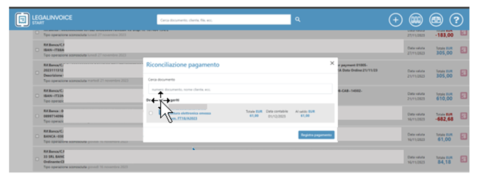 Con Riconciliazione Manuale il gestionale suggerisce i documenti che presentano corrispondenze con il movimento e ne propone la riconciliazione attraverso la registrazione del pagamento.
