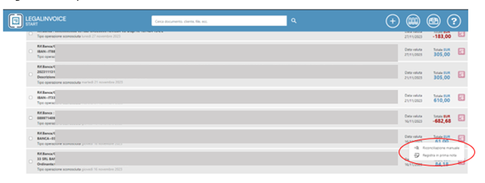 Tutti i movimenti per i quali il gestionale non è riuscito a identificare una corrispondenza significativa sono disponibili per una riconciliazione manuale. In questo caso sarà possibile gestire una riconciliazione attraverso il tasto azioni che prevede due possibilità: Riconciliazione manuale o Registrazione in prima nota.