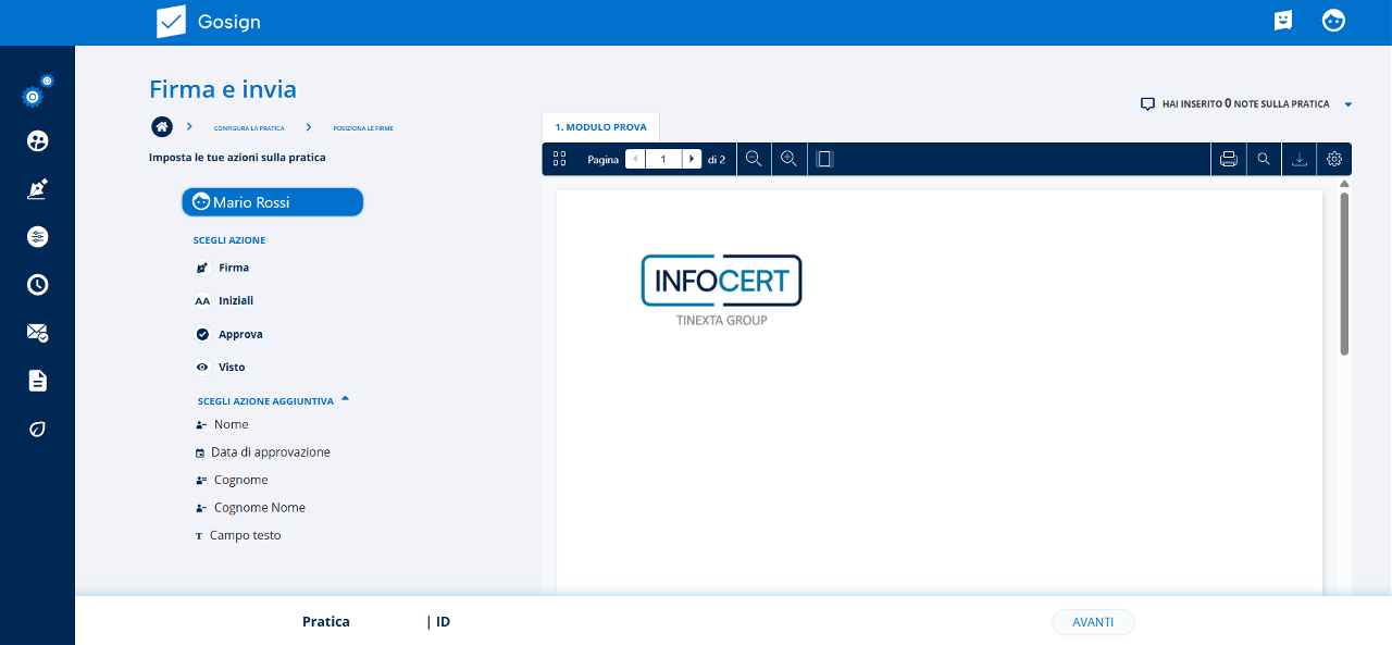 Con un clic sul tasto Avanti, posso procedere nella creazione della pratica. Nella sezione successiva posso scegliere le azioni da eseguire sul documento, elencate sulla parte sinistra.