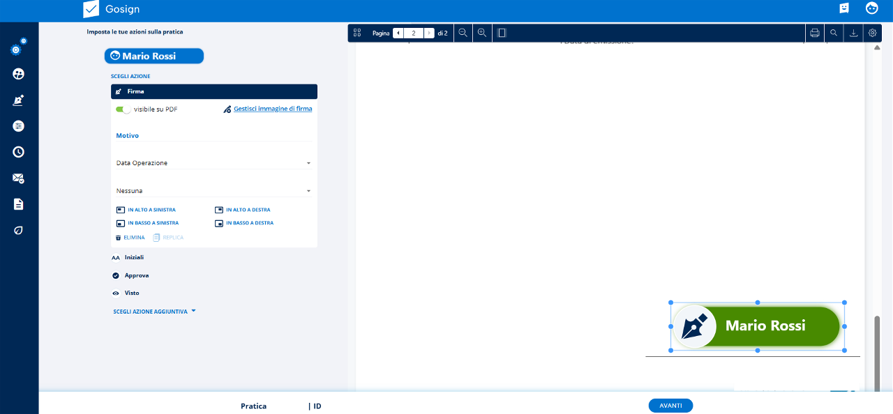 Le azioni disponibili principali riguardano il posizionamento della firma vera e propria oppure quello delle iniziali, dell’approvazione e della presa visione del documento.