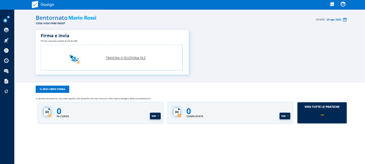 Dopo aver effettuato l’accesso su GoSign Web, posso avviare l’operazione di Firma e Invia con un clic sulla sezione corrispondente o, in alternativa, trascinando il file da firmare.