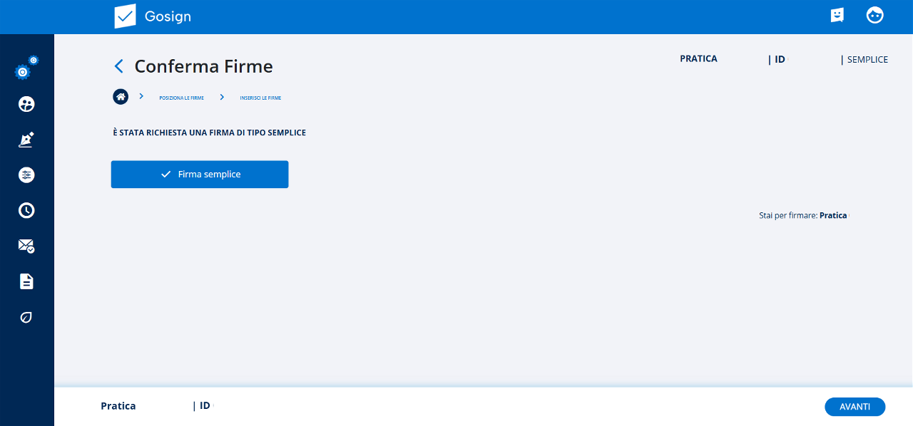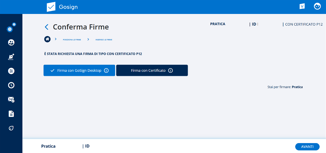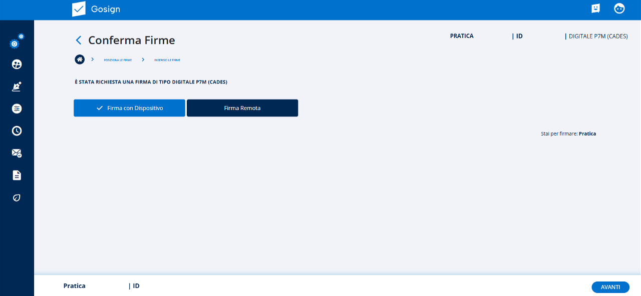 Con un clic sul tasto Avanti, posso procedere con la firma del file della pratica. In base alla tipologia di firma scelta, il sistema mi proporrà un menu differente.
