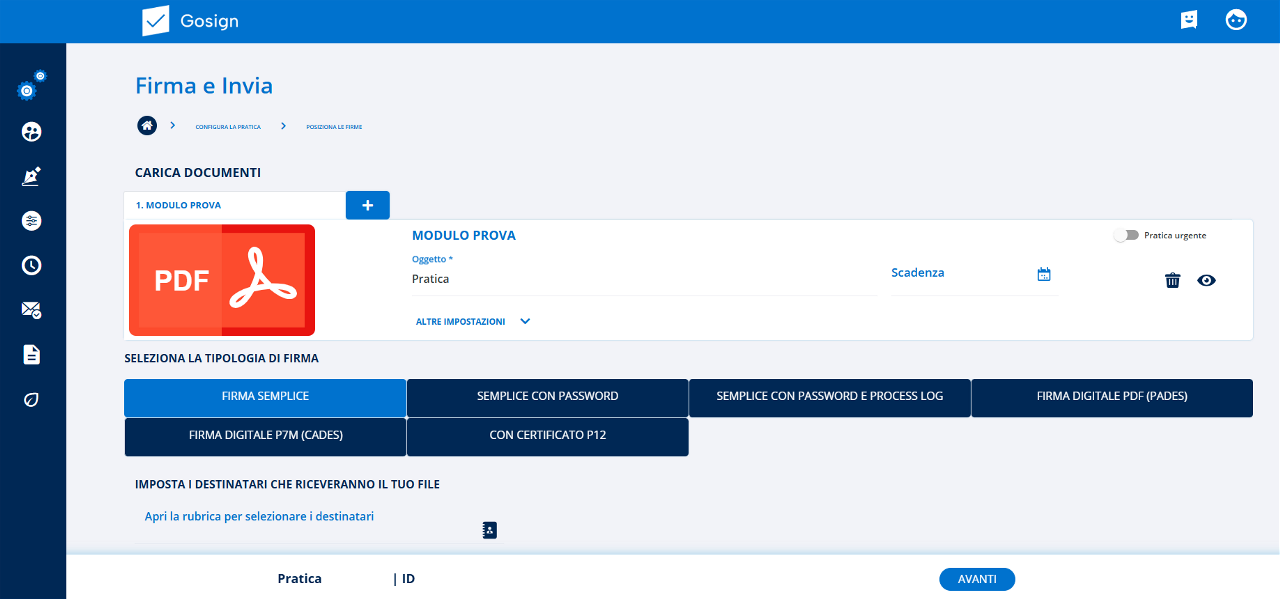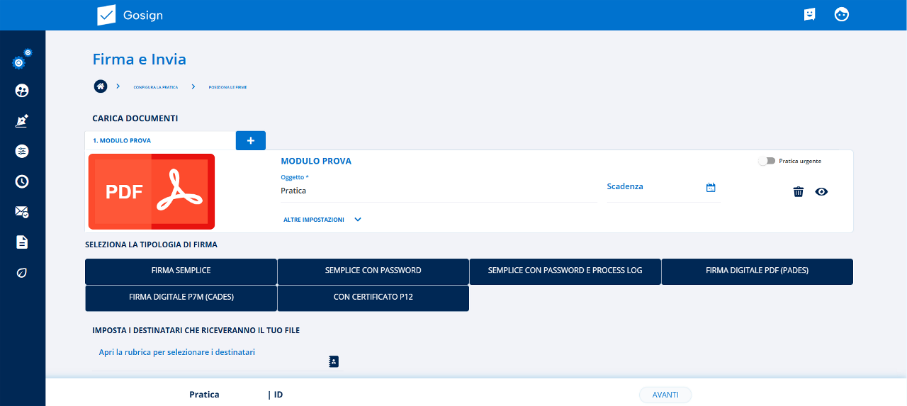Una volta selezionata la tipologia di firma da utilizzare, avrò a disposizione la schermata che mi permette di configurare la pratica da sottoscrivere digitalmente e condividere.