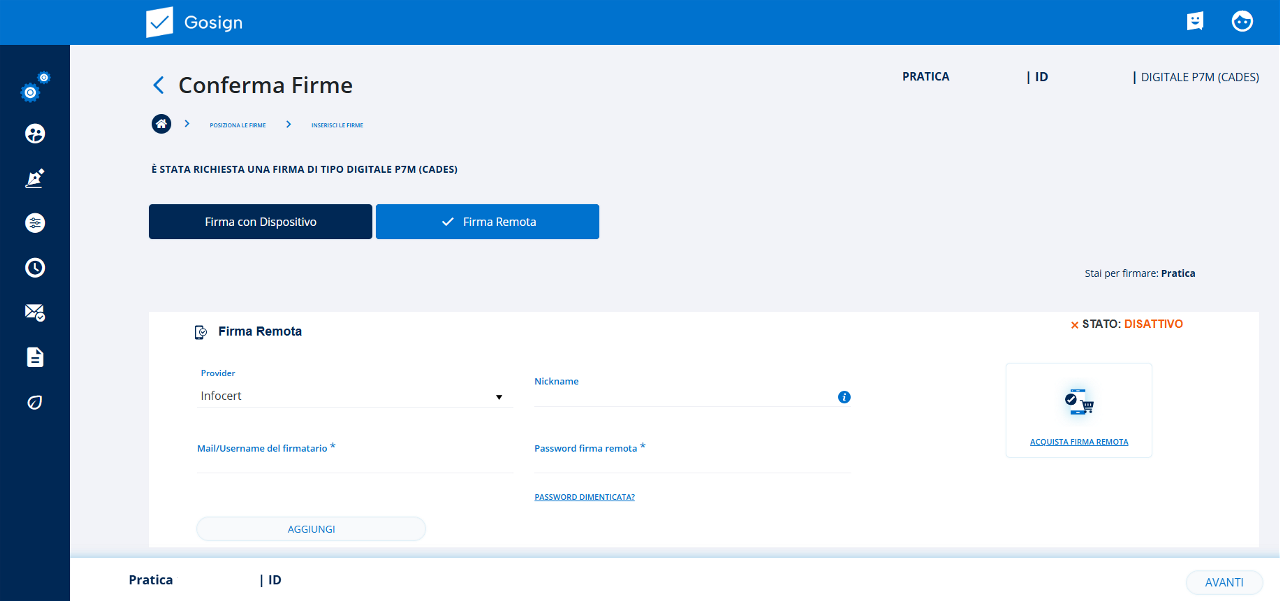 Se opto per la firma remota InfoCert, dovrò inserire: