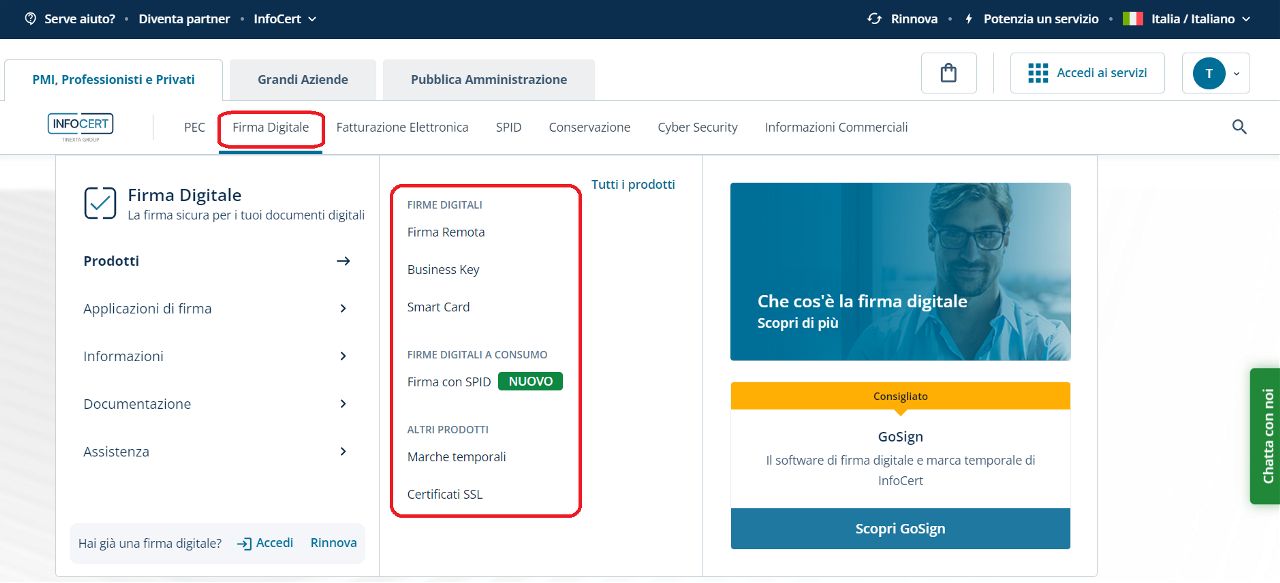 La seconda modalità per acquistare i prodotti InfoCert prevede il click, sul prodotto d'interesse, dal menu principale.