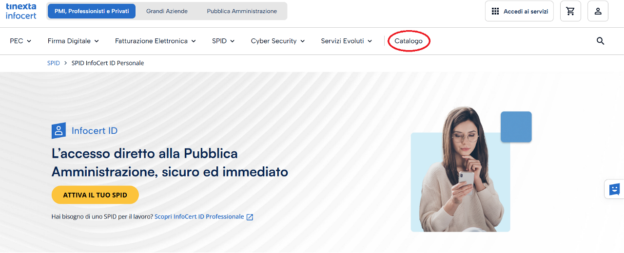 Una delle modalità per acquistare prodotti InfoCert prevede il click, nella homepage del sito, sull'icona del "Carrello" e poi su "Vai al Catalogo".