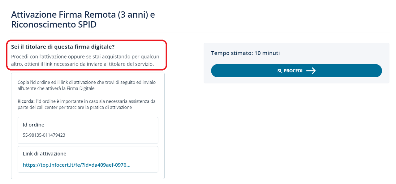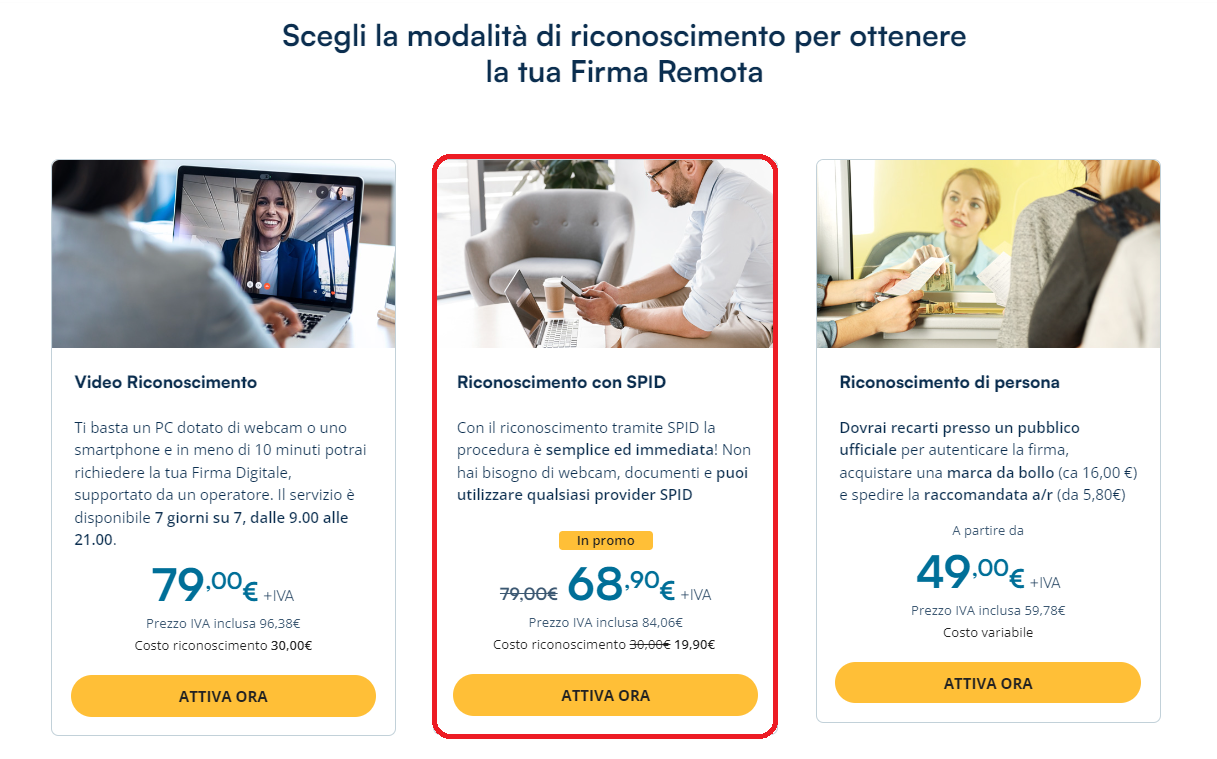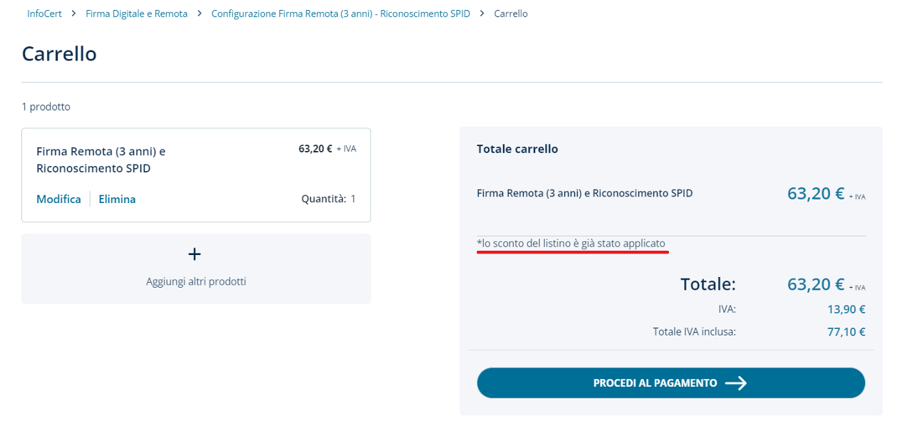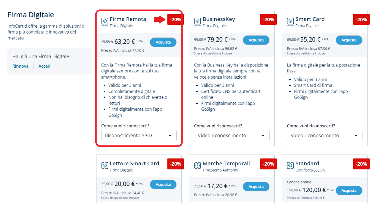 In questa guida, a titolo d'esempio, viene proposto l'acquisto della Firma Remota con riconoscimento SPID. Clicca su "Acquista" per procedere con il pagamento.