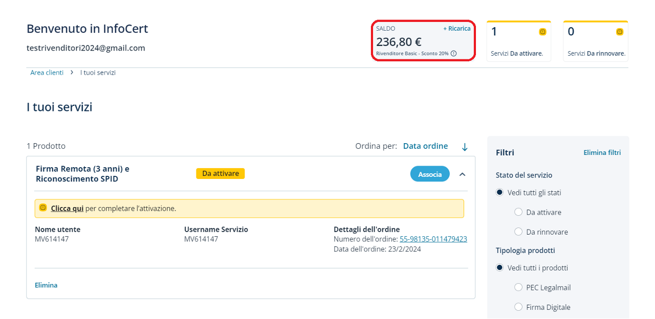 A breve riceverai un email di riepilogo all'indirizzo di posta da te utilizzato per registrarti come Rivenditore Web InfoCert.