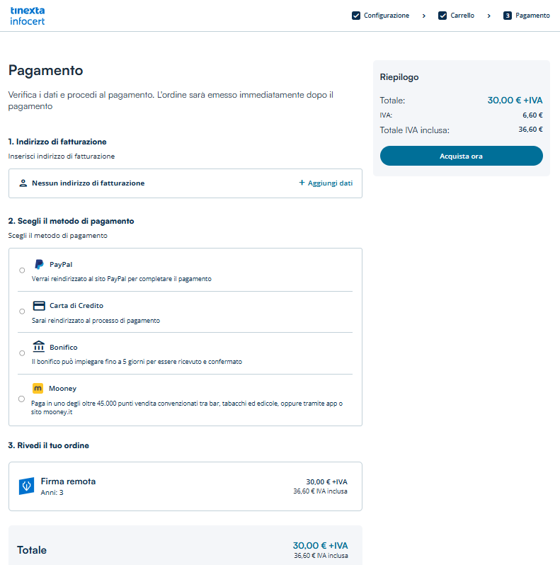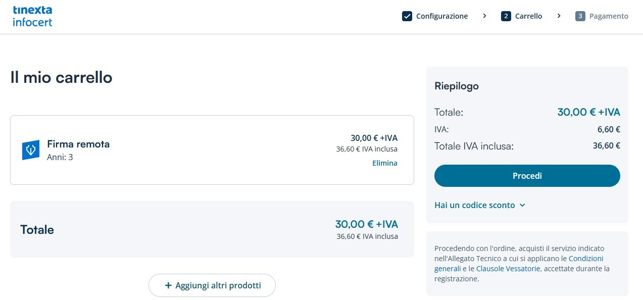 La scelta dell’opzione Acquista sul negozio InfoCert permette di essere trasferiti all’interno del negozio e procedere con l’acquisto del certificato.