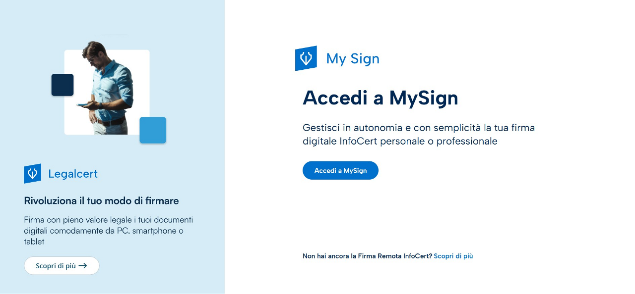 Cliccare su Accedi a My Sign per la gestione del certificato utilizzando le credenziali dell’account InfoCert.