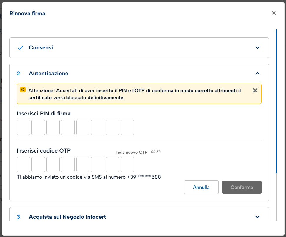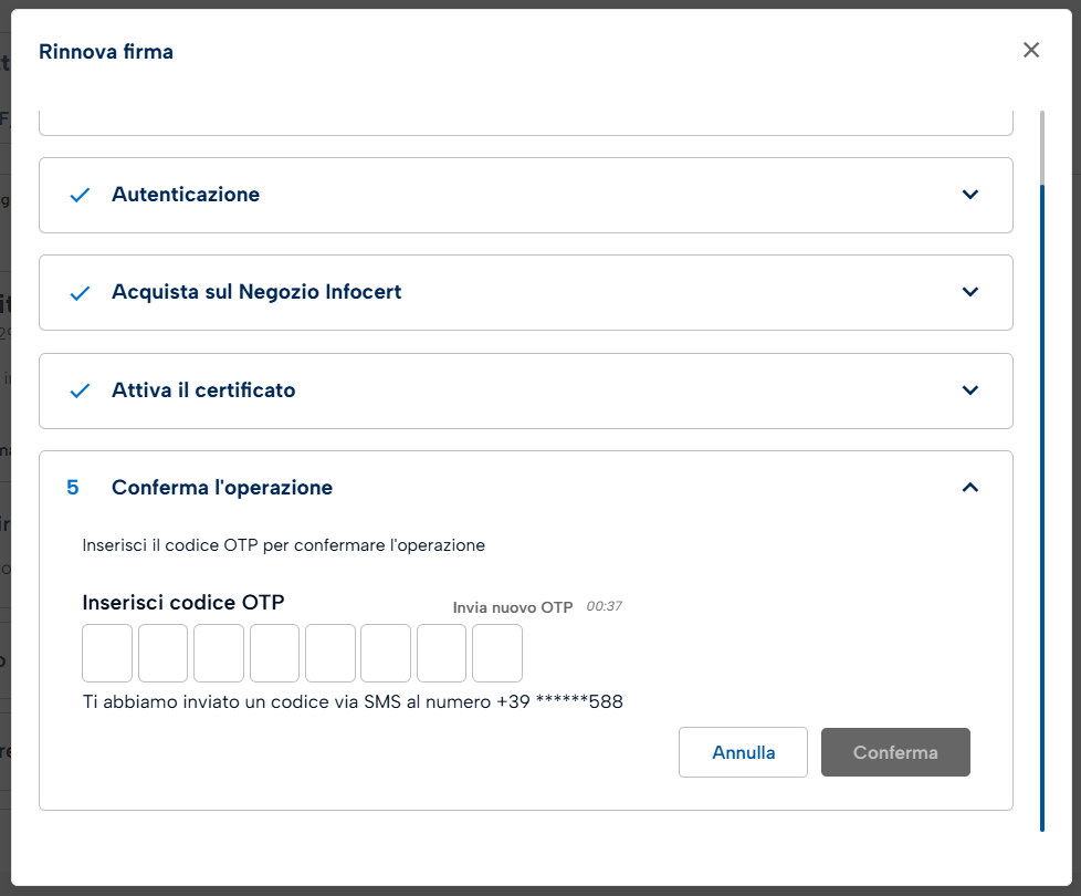 Non resta che confermare l’operazione di rinnovo inserendo il codice OTP ricevuto via SMS e cliccare su Conferma.