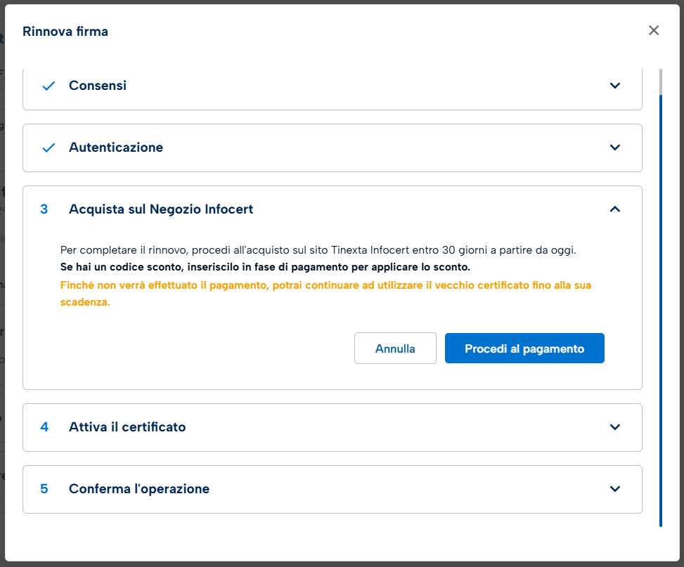 Le opzioni offerte prevedono l’acquisto diretto sul negozio InfoCert, l’utilizzo di un coupon o, in alternativa, il rinnovo presso l'ufficio di registrazione che ha provveduto al rilascio, il cui operatore procederà inserendo le sue credenziali RAO.