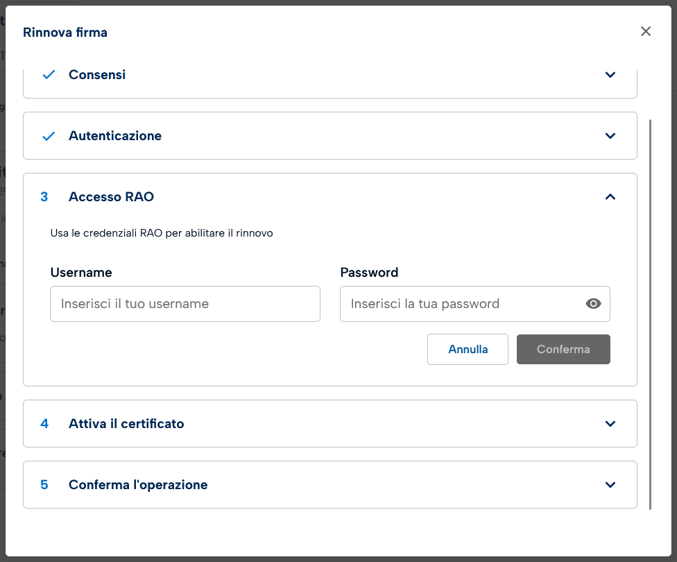 La scelta dell’opzione Rinnova con credenziali RAO è possibile quando il certificato è stato rilasciato da un’organizzazione (ad esempio quella per la quale si lavora/collabora a vario titolo) che desidera verificare direttamente l'effettiva sussistenza del ruolo inserito all'interno del certificato nel caso in cui il titolare del certificato abbia la necessità di utilizzare la propria firma remota per ulteriori tre anni, mantenendo un controllo diretto sull’operazione di rinnovo.