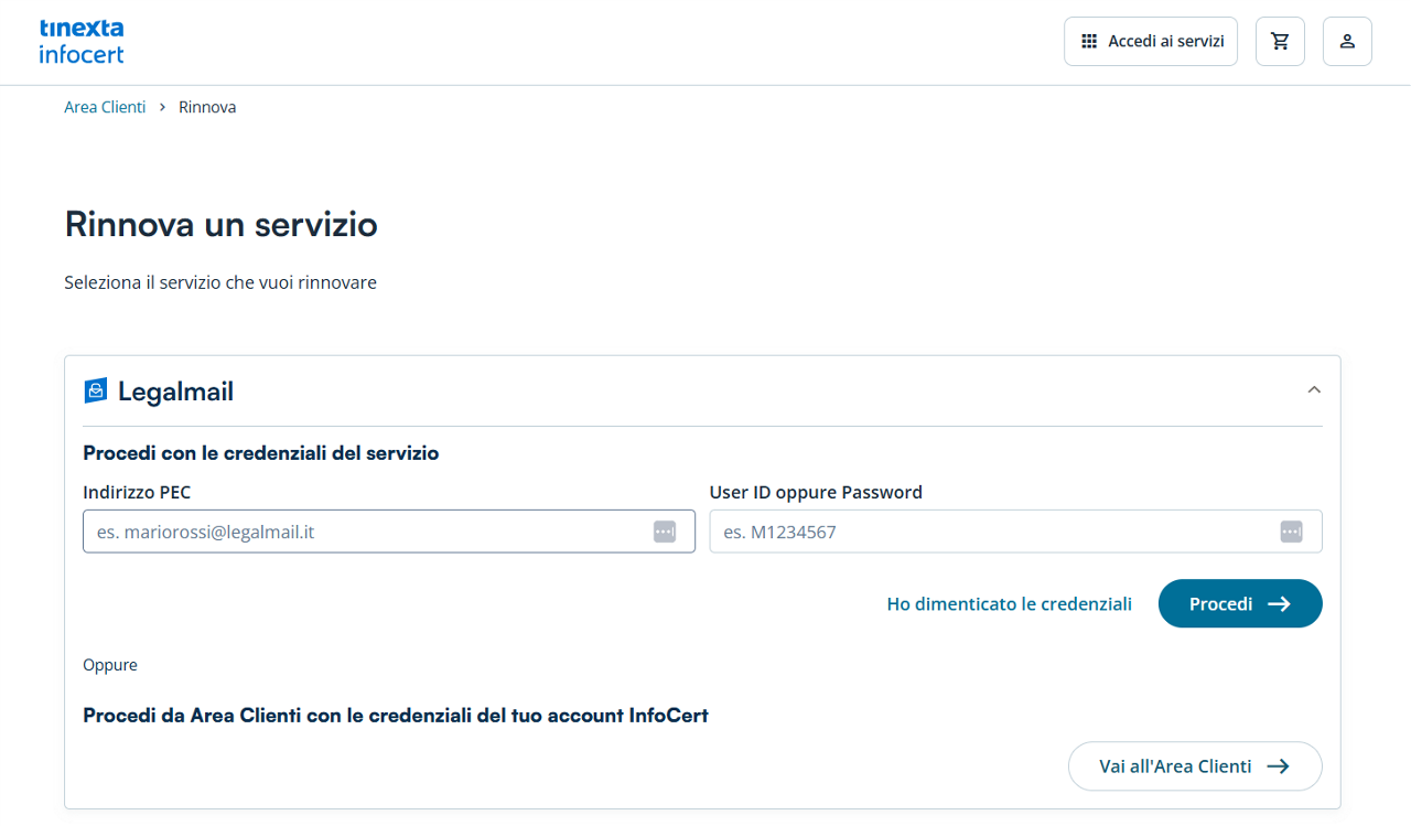 Una volta deciso di procedere con il rinnovo della casella, sarà possibile iniziare l’attività collegandosi alla pagina del sito InfoCert dedicata ai rinnovi.