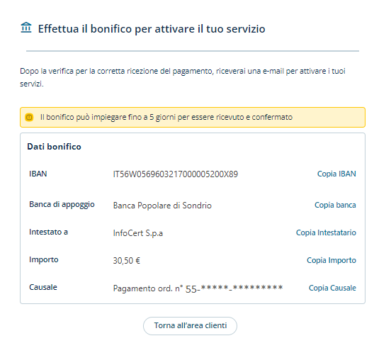 Importante: la scelta del bonifico come metodo di pagamento per eseguire il rinnovo deve essere portato a termine, sempre, attraverso la pagina del sito InfoCert dedicata ai rinnovi.