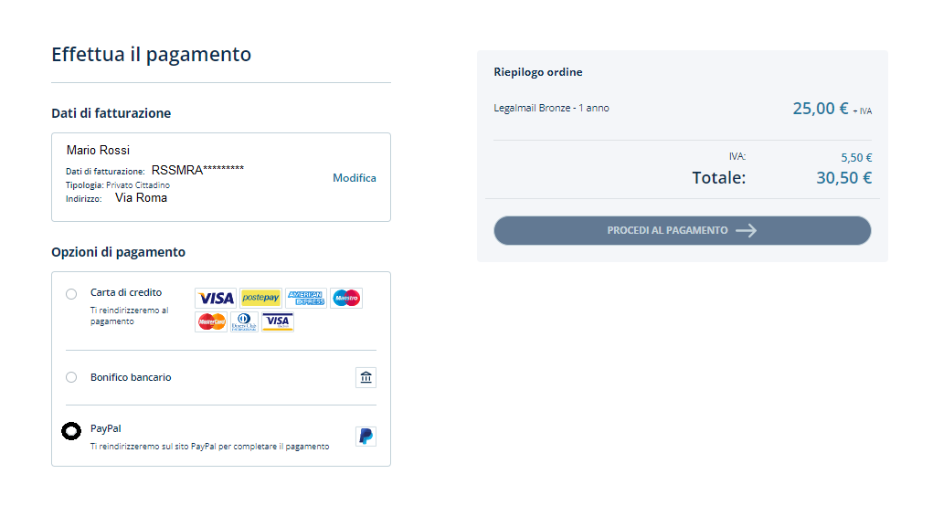Se si desidera eseguire il pagamento appoggiandosi all'account PayPal, si potrà selezionare l’opzione PayPal nel riquadro Opzioni di pagamento.