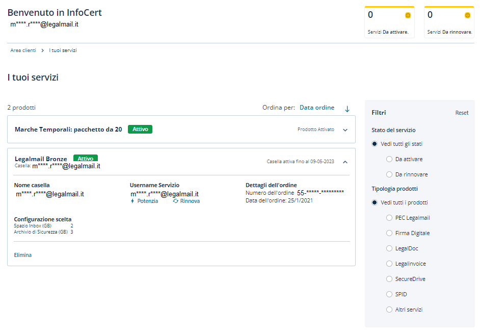 In alternativa, all'interno dell'Area Clienti è possibile trovare gli estremi della casella Legalmail da rinnovare e il pulsante Rinnova con il quale passare alla fase di acquisto.