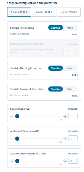 Il Negozio offre la possibilità di rinnovare la casella certificata con le stesse caratteristiche che aveva al momento dell’acquisto, per un anno o per un periodo più lungo di tempo.