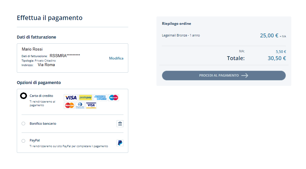 Il passo successivo consiste nella verifica e conferma dei dati di fatturazione nonché nella scelta del sistema di pagamento che si preferisce, tenendo presente che la scelta del bonifico comporterà il buon esito dell’acquisto solo a ricezione del pagamento da parte di InfoCert.