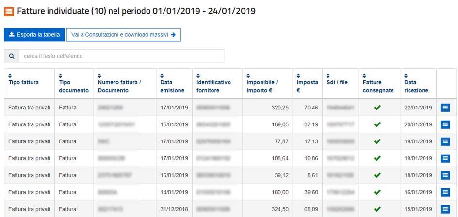 Il portale Fatture e Corrispettivi mi mette a disposizione l’elenco delle fatture identificate dai parametri di ricerca.