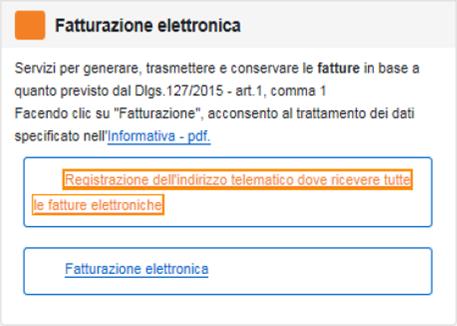 Dopo aver selezionato l’area Fatturazione Elettronica nella sezione Fatture e Corrispettivi , accedo alla voce Registrazione dell’indirizzo telematico dove ricevere tutte le fatture elettroniche.