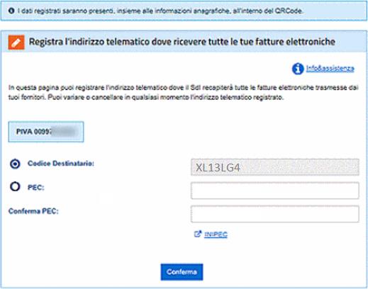 Alla conferma, un messaggio di avviso ribadirà quello che accade dal momento in cui viene registrato l’indirizzo telematico: tutte le fatture destinate alla P. IVA che ha eseguito la registrazione verranno sempre e comunque inviate utilizzando il Codice Destinatario o l'indirizzo PEC inserito.