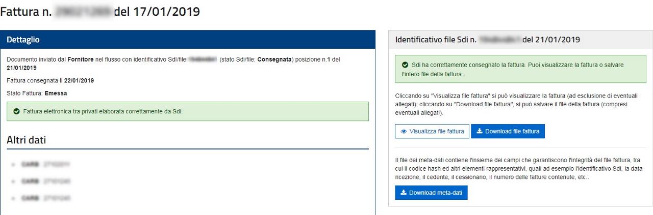 Nella parte sinistra delle schermo trovo i dati di dettaglio della fattura; a destra trovo le funzionalità per eseguire il download della fattura stessa.