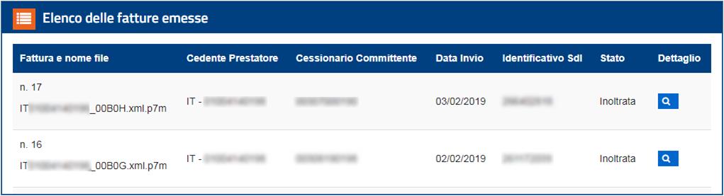 A questo punto il portale Fatture e Corrispettivi mi mostra l’elenco delle fatture che ho ricevuto. Una volta individuato il documento di interesse, posso accedere al dettaglio fattura con un clic sull’icona blu posta a fianco di ogni singolo documento.