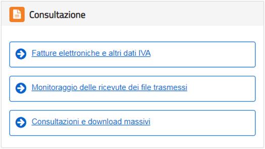 Dopo aver eseguito l'accesso alla sezione Fatture e Corrispettivi dell’Agenzia delle Entrate, accedo alla voce Monitoraggio delle ricevute dei file trasmessi posto all’interno dell’area Consultazione .