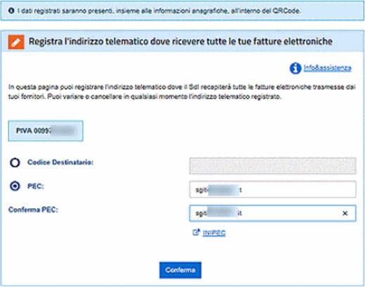 In alternativa posso inserire, confermandola, una casella PEC di riferimento e procedere con un clic sul pulsante Conferma.