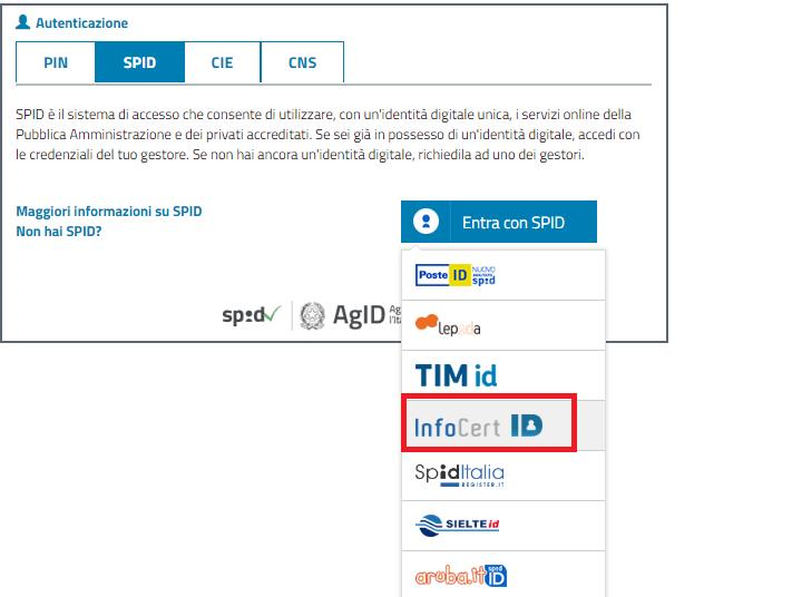 La prima cosa che dovrò fare è aprire il sito a cui voglio accedere, scegliere di accedere con SPID e selezionare l'opzione del fornitore di servizi: InfoCert ID.
