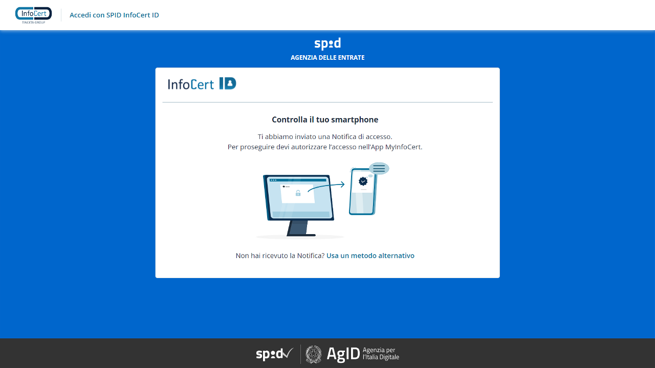 A questo punto ti viene indicato di controllare il Cellulare associato al tuo account SPID InfoCert ID, dal momento che ti è appena stata inviata una "Notifica di accesso".