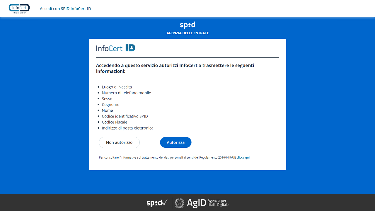 Nel momento in cui l'autenticazione viene validata ci viene richiesto di autorizzare InfoCert a trasmettere le seguenti informazioni al Portale presso quale sto effettuando l'accesso.