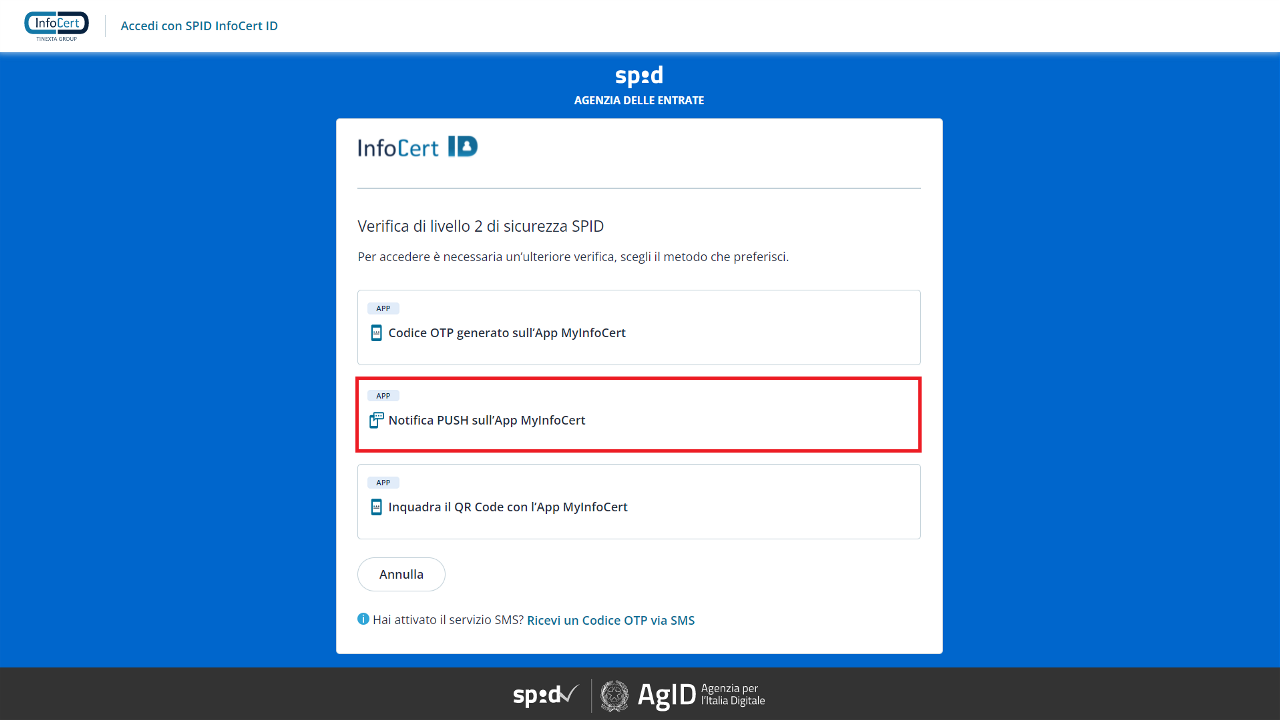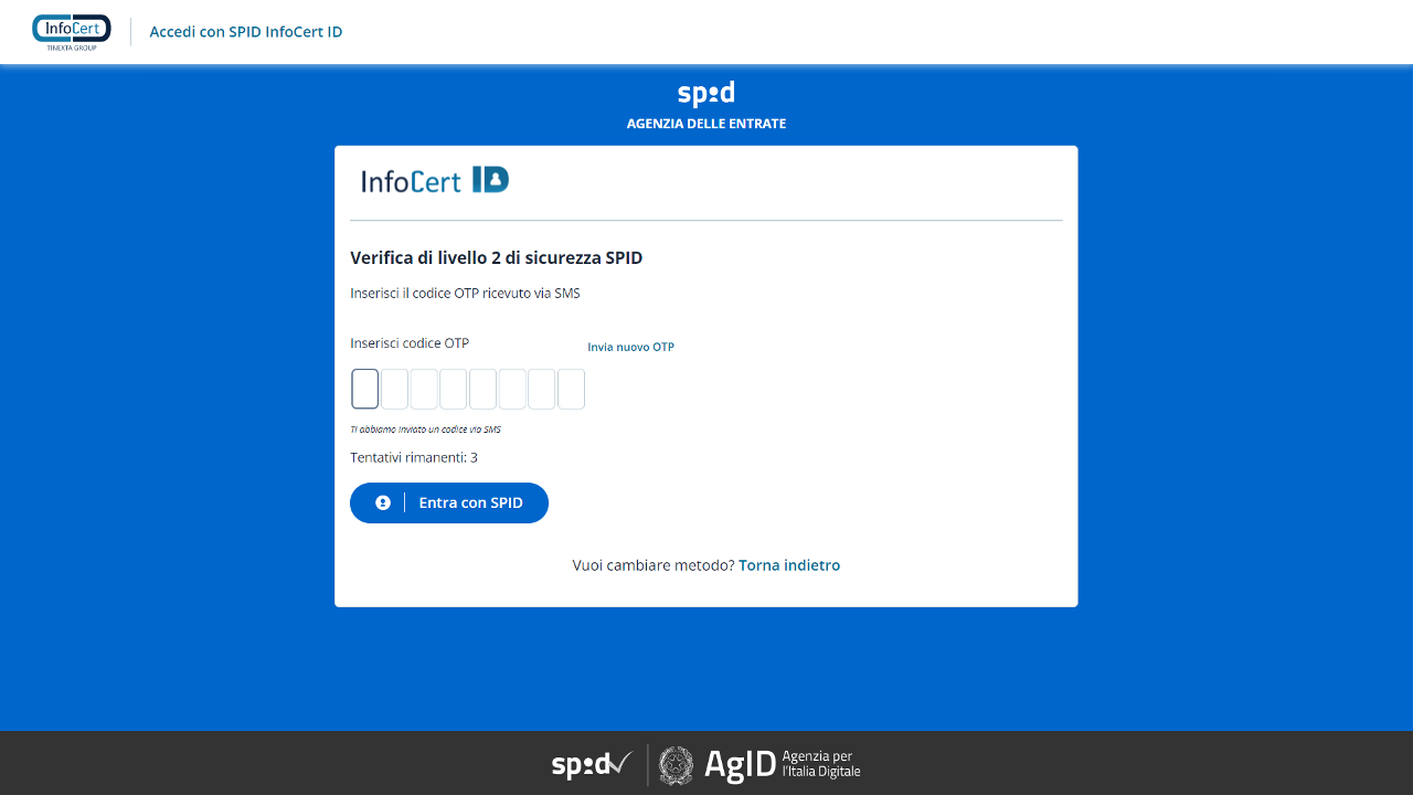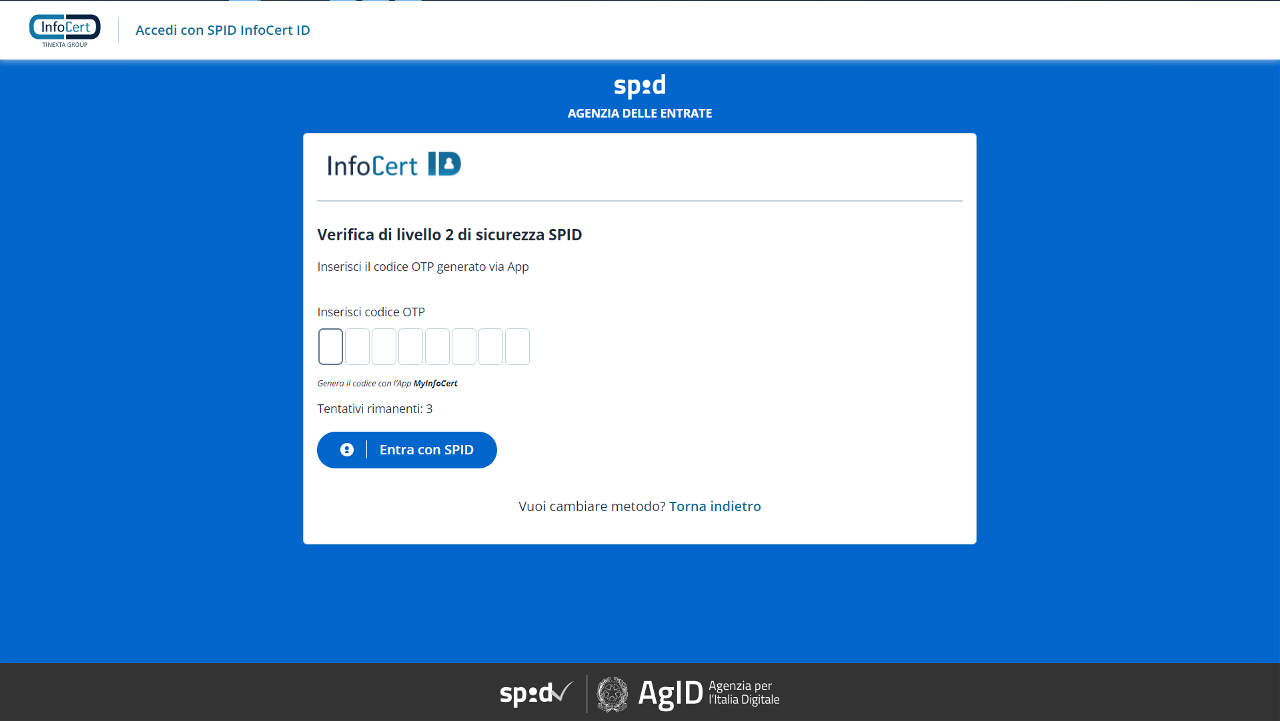 La maggior parte dei Portali dei Fornitori di Servizi richiede per effettuare il Login un'autenticazione forte (anche detta di "Livello 2"), ciò significa che non è sufficiente soltanto inserire le proprie credenziali SPID InfoCert ID (Nome Utente e Password) ma viene richiesto l'inserimento di un ulteriore elemento (es. Codice OTP) per rendere più sicura l'autenticazione al sito.