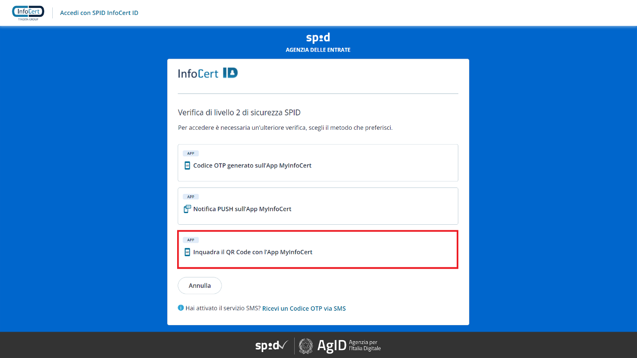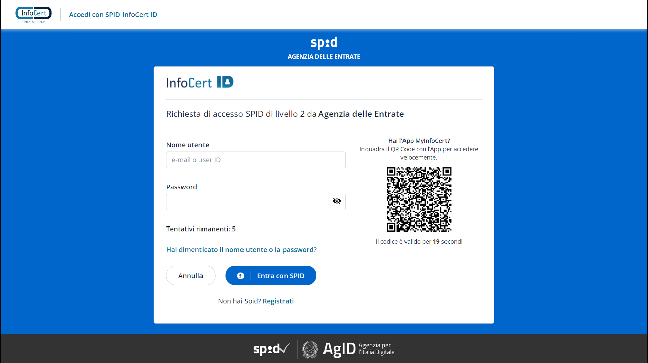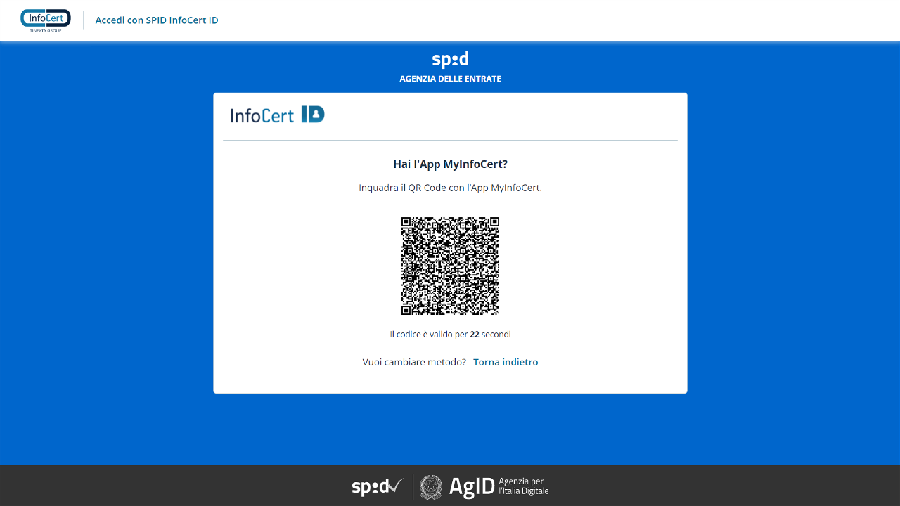 Con questa modalità di accesso hai il vantaggio di non dover ricordare le credenziali SPID InfoCert ID, ma ti basterà scansionare il codice QR presente nella pagina di accesso del Fornitore di Servizi attraverso l'App My Infocert.