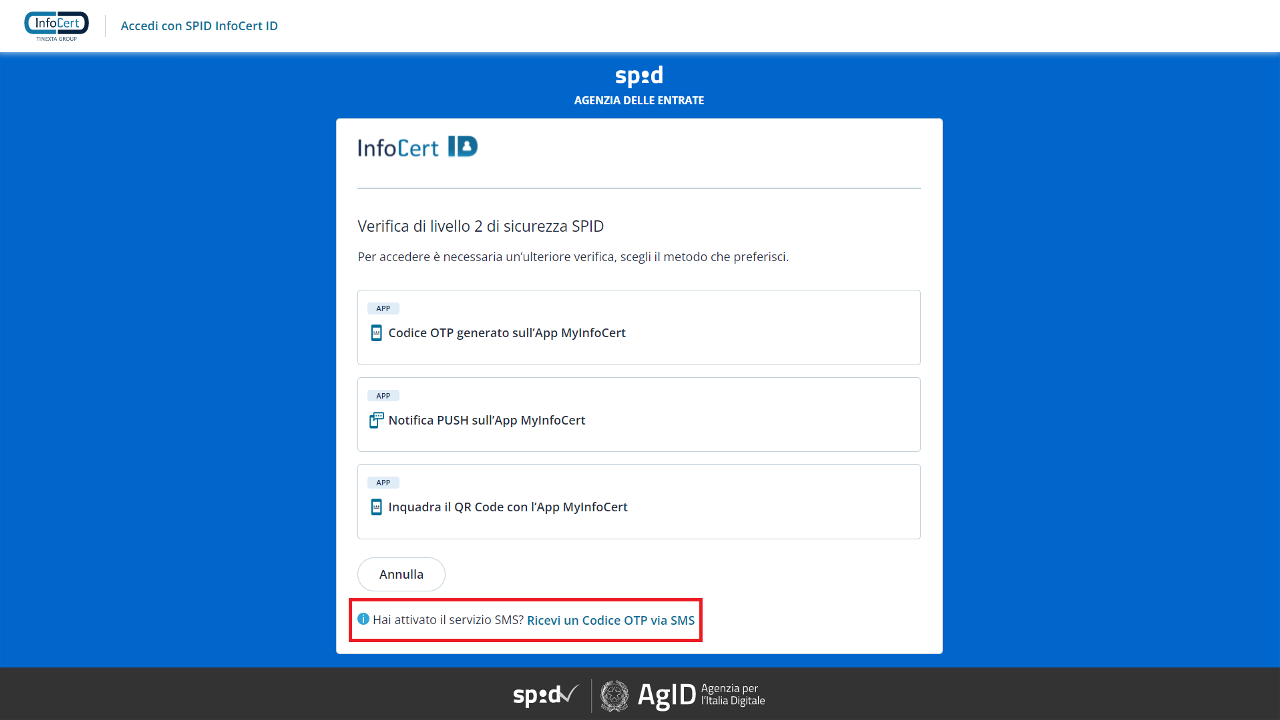 Questa modalità di autenticazione forte consente a chi non può utilizzare l'App My Infocert sul proprio Smartphone di ricevere il codice OTP (One Time Password) direttamente come SMS al numero di Cellulare associato all'account SPID InfoCert ID.