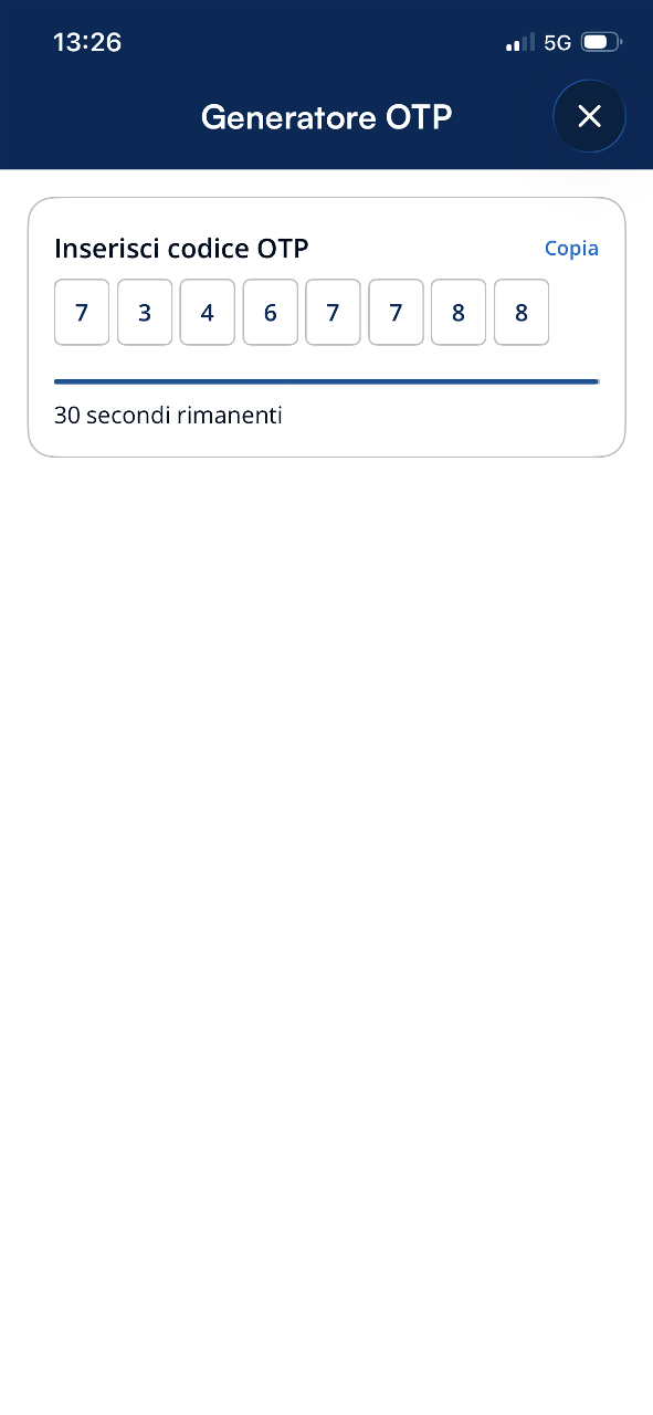Si ricorda che il Codice OTP ha una validità di 30 secondi, scaduti i quali si auto rigenera sull'App. Per tale motivo, è richiesto un inserimento tempestivo per poter validare l'autenticazione forte.