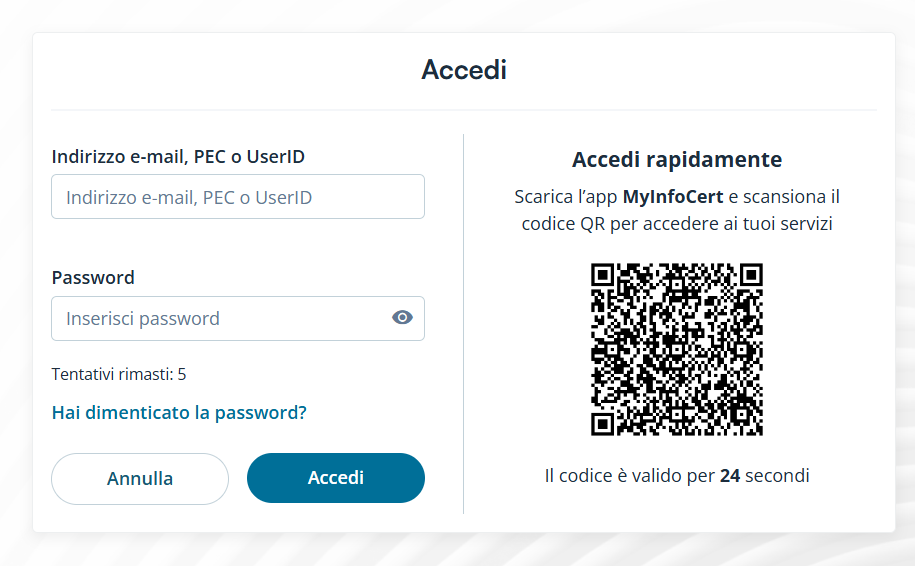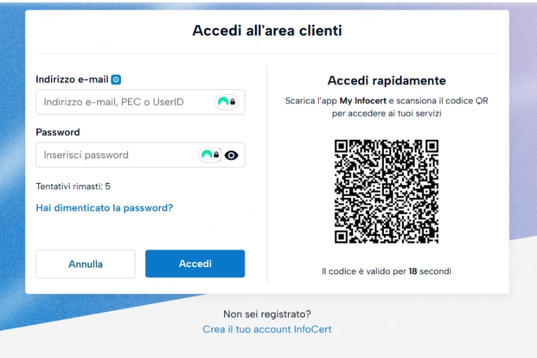 Il passo successivo consiste nell’accesso al proprio account Infocert (tramite l’inserimento di e-mail, PEC e password) o con la scansione del QR Code tramite l’App My Infocert se già registrati.