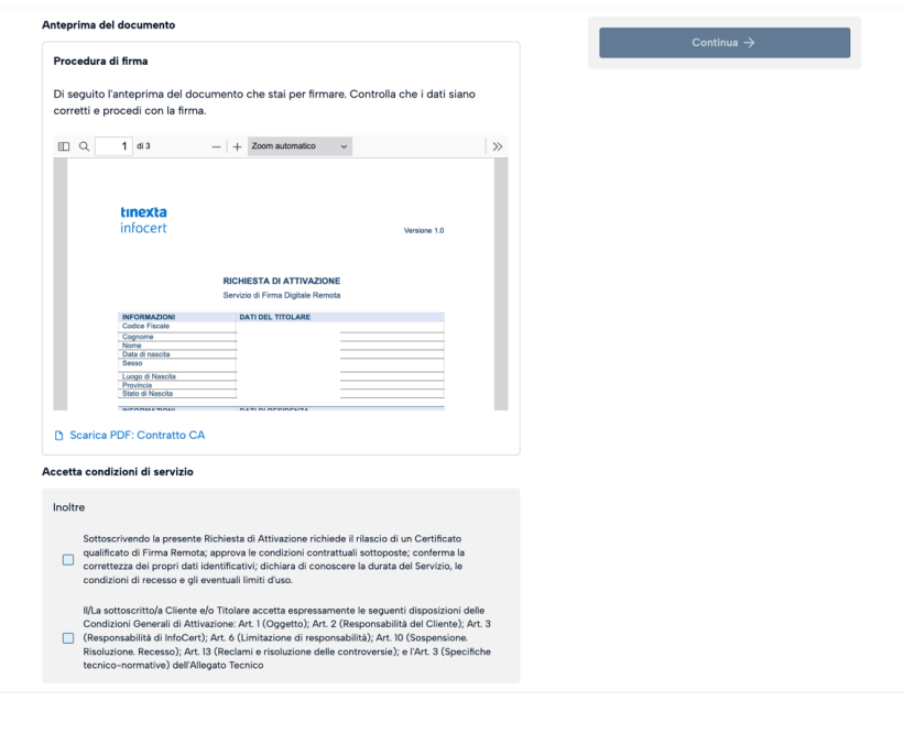Mettere le due spunte e cliccare sul tasto Continua per arrivare al passaggio seguente relativo alla firma del contratto.