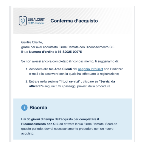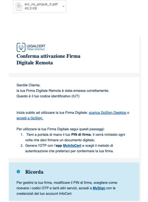 Nell’e-mail fornita si riceverà la conferma di attivazione della Firma Remota.