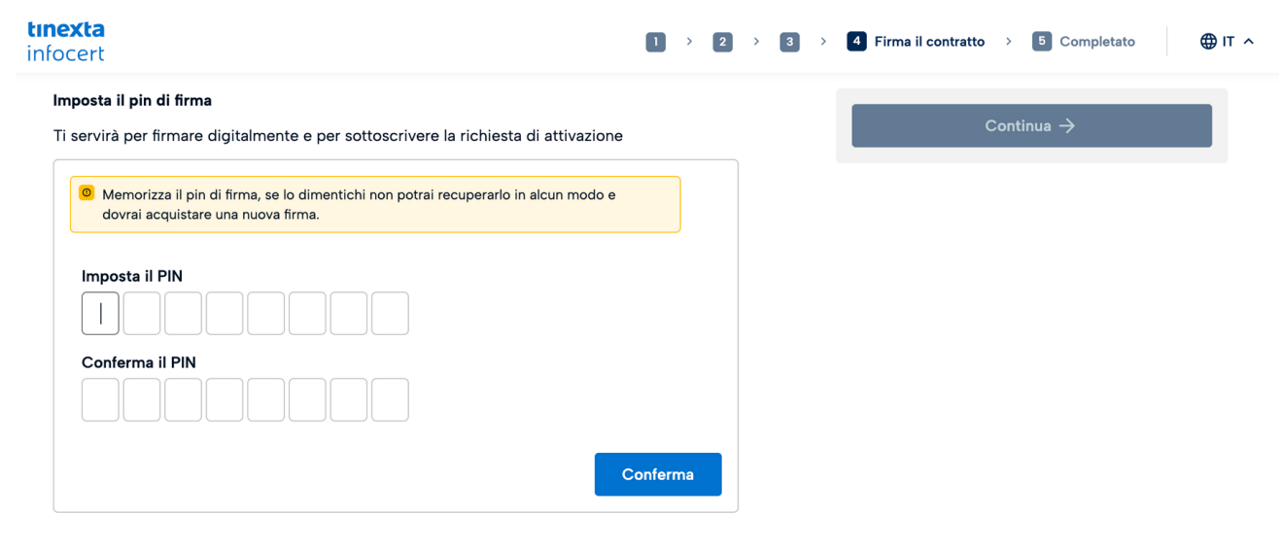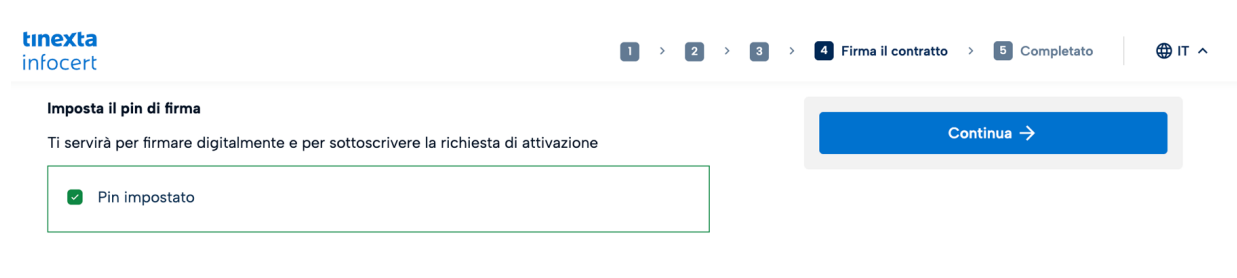 La firma del contratto al punto 4 prevede l’impostazione del PIN per la firma dei documenti e l’inserimento del codice di sicurezza OTP ricevuto via SMS.