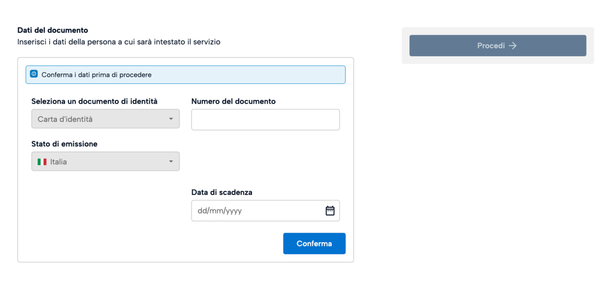 Inserire e confermare anche i dati del documento dell’intestatario del servizio.