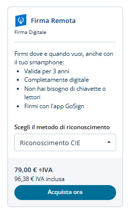All’interno del sito Tinexta Infocert, nella sezione dedicata all’acquisto dei certificati di Firma Digitale, è possibile acquistare una Firma Remota scegliendo, come opzione di attivazione, il riconoscimento tramite CIE.