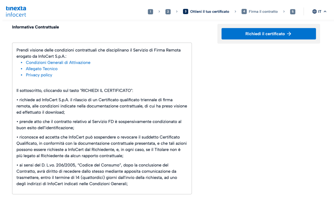 Sarà necessario cliccare sul tasto Richiedi il Certificato per passare allo step successivo.