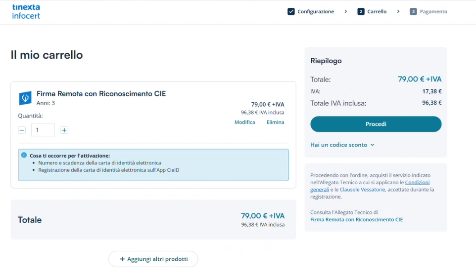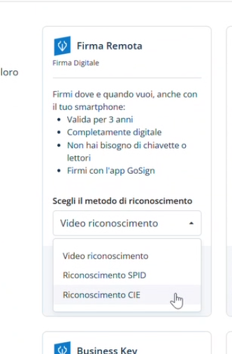 Su Catalogo di Tinexta Infocert è possibile selezionare il prodotto Firma Remota e scegliere il riconoscimento con CIE.