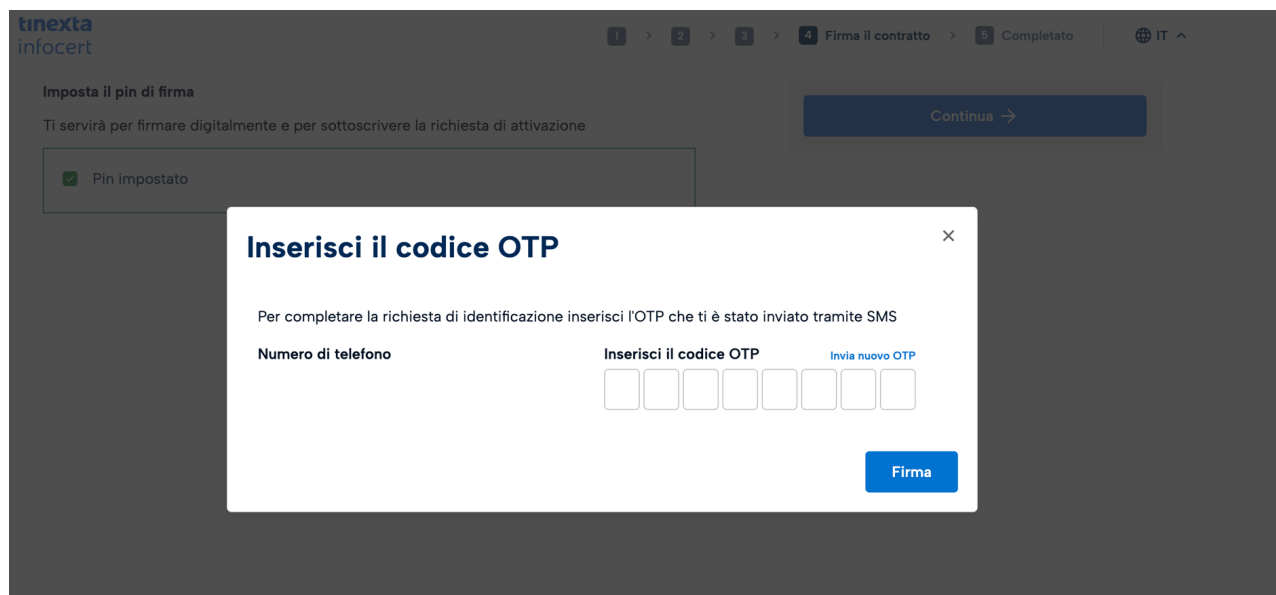 Dopo aver impostato il PIN di firma arriverà sul cellulare fornito l’OTP per completare la richiesta di identificazione.