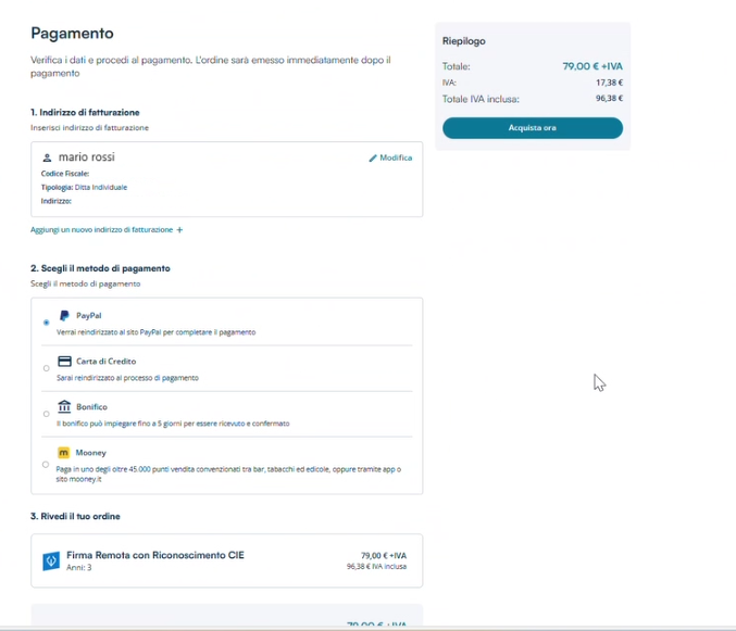 Per completare l'acquisto della Firma Digitale scegliere il metodo di pagamento (Carta di credito, Mooney, PayPal, Bonifico bancario), se non presenti inserire i dati di fatturazione da +Aggiungi dati di fatturazione.