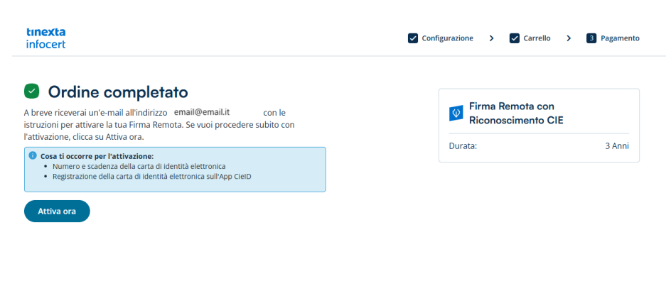 Dopo l’inserimento / conferma dei dati di fatturazione ed aver eseguito l’acquisto, questo verrà confermato e sarà possibile cliccare sul tasto Attiva ora per procedere con l’attivazione.