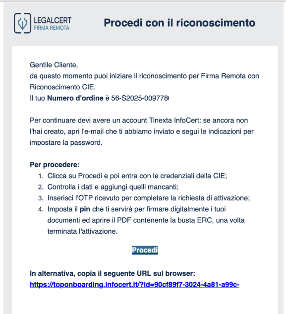 In alternativa è possibile proseguire in altro momento attraverso il link e le istruzioni ricevute via e-mail.