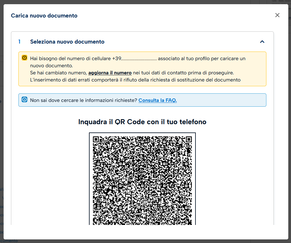 Si aprirà una finestra con una serie di avvisi utili (tra cui una FAQ utile per comprendere come deve essere inqudarato il documento d'identità) per il proseguimento dell'operazione e la presenza di un codice QR al centro della pagina.